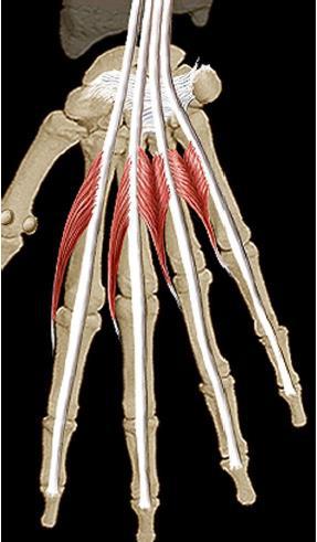 - Base des phalanges proximales des 2e,3e et 4e doigts.