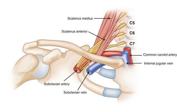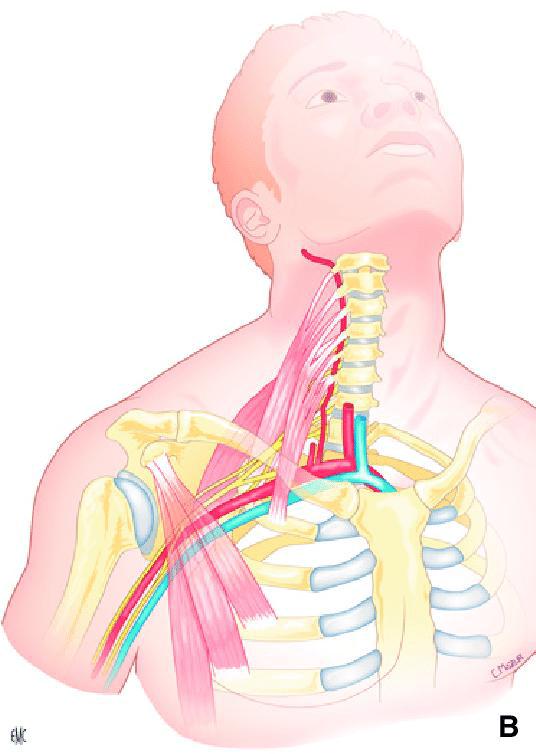 1-Dans sa partie supra-claviculaire, il traverse la région cervicale où il chemine dans l’espace inter-scalénique (entre le scalène antérieur et le scalène moyen)