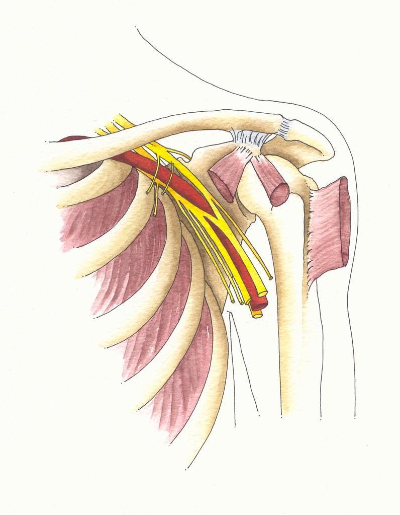 2- puis il passe en arrière de la clavicule pour traverser la région axillaire (partie infra-claviculaire), entre le petit pectoral en avant et le subscapulaire en arrière, où il est en rapport avec l’artère axillaire.
