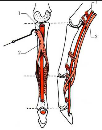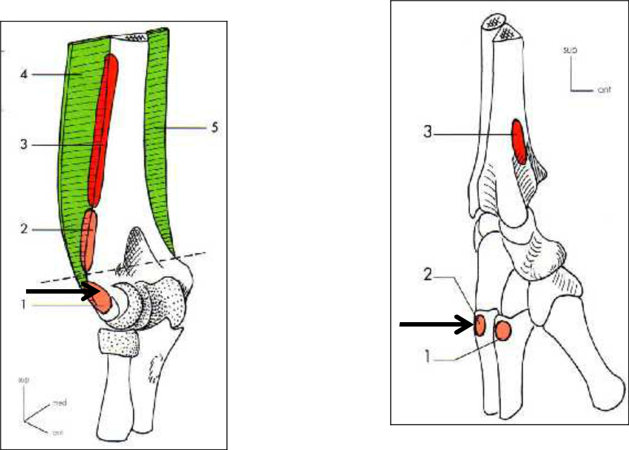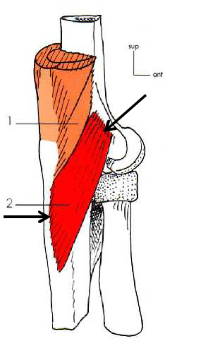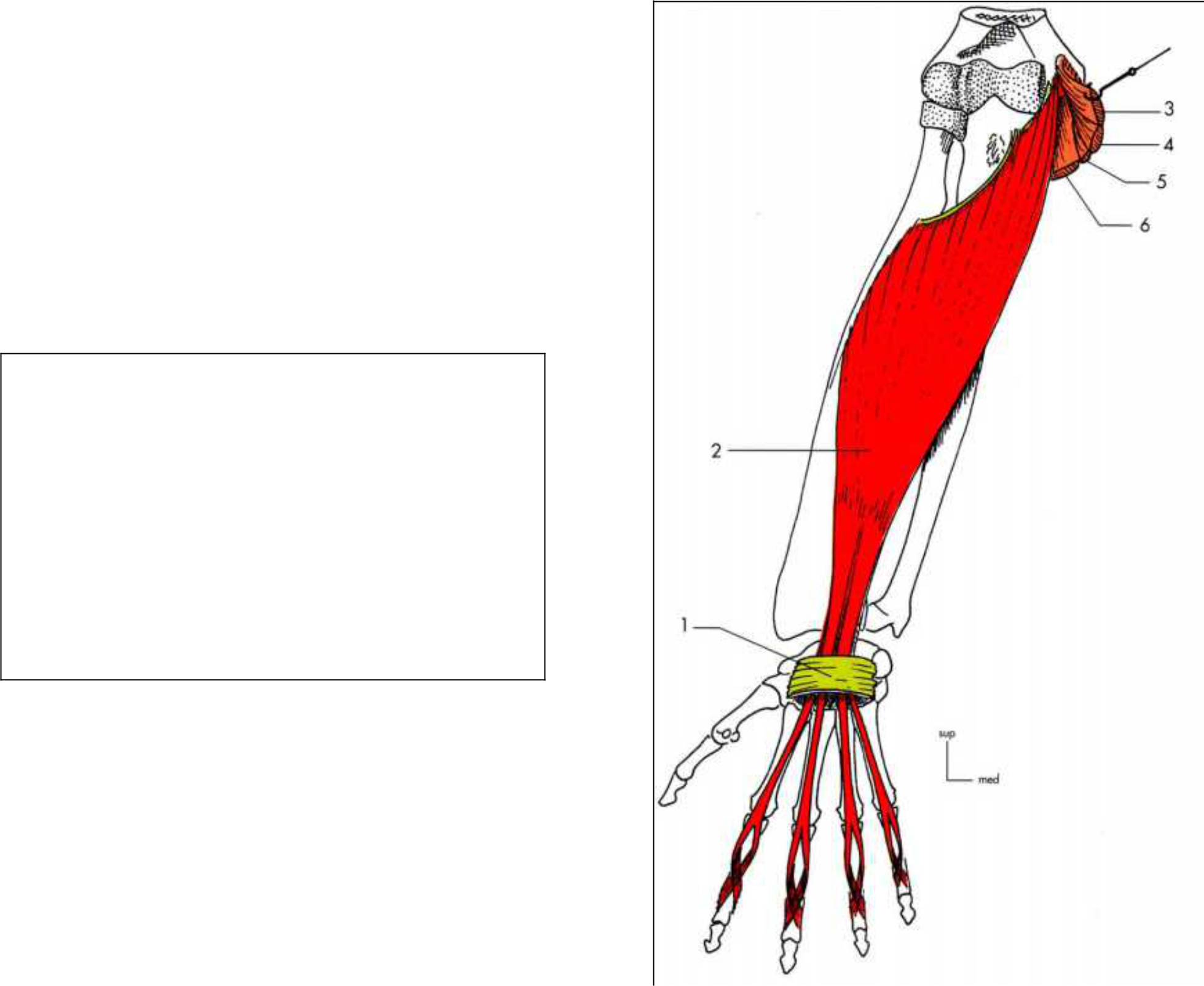 Vue dorso-latérale de l’avant bras 1-Extenseur ulnaire du carpe 2-rétinaculum des extenseurs