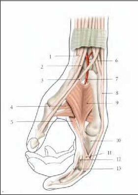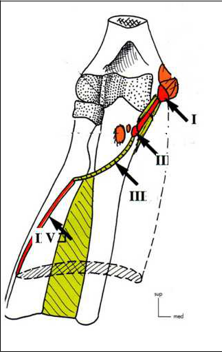Latéralement: tendon du muscle long abducteur et court extenseur