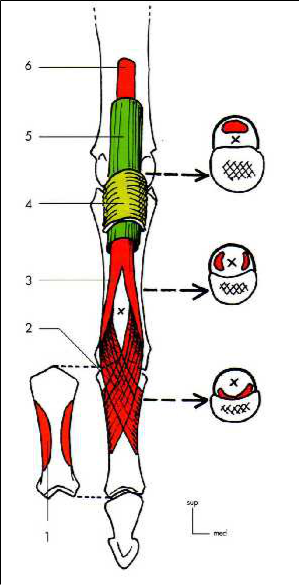 En quatre tendons Chaque tendon se divise en O3 languettes :