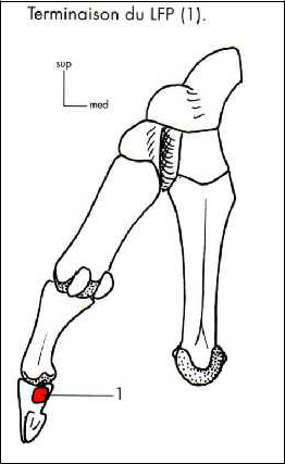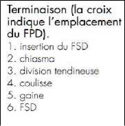 par un tendon à deux languettes en forme de boutonnière sur la 2èmephalange des quatre derniers doigts (perforée par le tendon du fléchisseur profond des doigts)