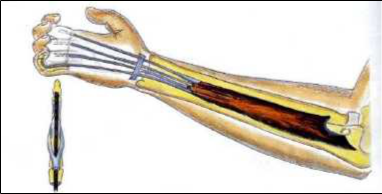 face post de l’ulna et membrane interosseuse(situé sous le long extens du pouce)