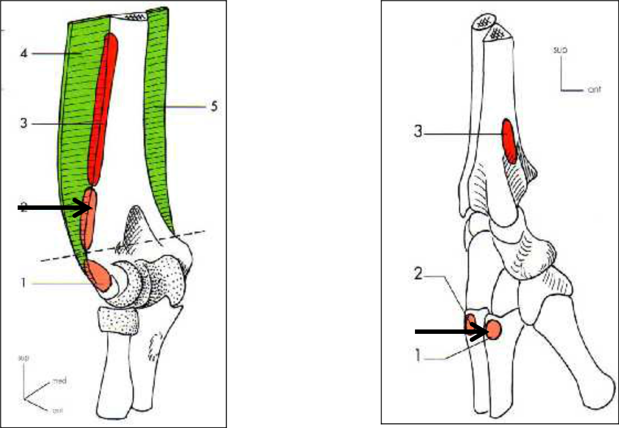 Base de la face antérieure du deuxième métacarpien (et expansion vers le troisième)