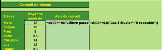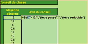Objectif : Partons sur un cas simple. Dans la colonne Avis du conseil doit apparaître le texte L’élève passe si sa moyenne générale est supérieure ou égale à 10 et L’élève redouble dans le cas contraire.