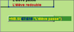 Dernier petit point; vous notez la présence d‛une cellule verte en bas de la colonne E. Cette cellule doit afficher le nombre d‛étudiants admis. Nous savons faire des sommes sur des valeurs numéri-ques mais qu‛en est il lorsqu‛il s‛agit de compter des cellules de texte ?