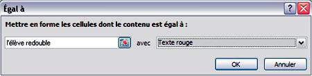 Il convient maintenant de faire ressortir en couleur les élèves qui redoublent pour avoir une idée de la proportion de réussite par le biais d‛une lecture rapide de la feuille. Pour cela, nous mettons en oeuvre le format conditionnel que nous avions énoncé dans un support que vous trouverez à cet-te adresse : http://www.assistance-en-informatique.com/format-conditionnel-excel_120.aspx