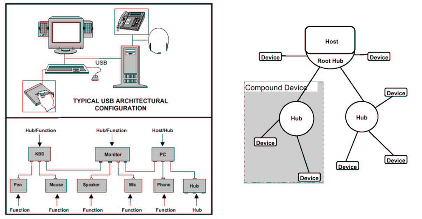 Les périphériques USB peuvent posséder la fonction HUB, c’est le cas sur l’image de gauche pour l’écran et le clavier.