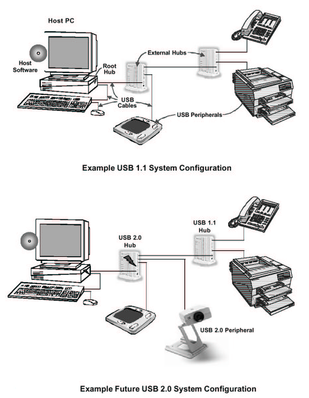 L’USB 2 est compatible avec l’USB 1 a la condition de disposer les HUB version 2 en haut de la hiérarchie de raccordement et les HUB version 1 avec uniquement des périphériques version 1 derrière eux.