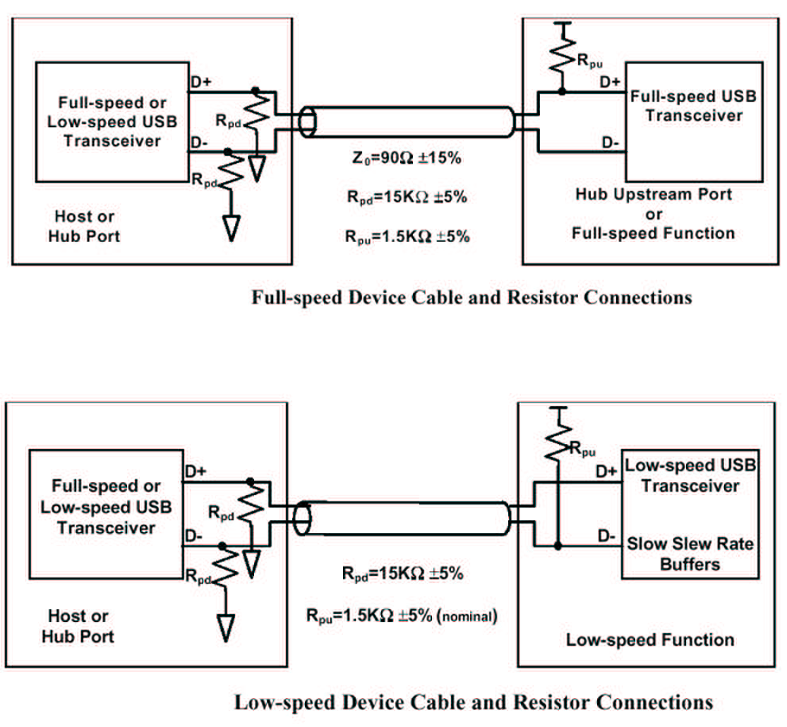 Une résistance de tirage sur l’une des lignes deux lignes de données permet au système d’identifier les périphériques haute et basse vitesse.