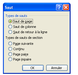 Nb : il y a deux sortes de sauts de page Automatique : il est effectué quand une page est remplie le curseur passe automatiquement à la page suivante Manuelle : effectué par l’utilisateur quand il besoin de changer de page soit à partir de la boîte de dialogue saut du menu insertion Ou par le raccourci du clavier |