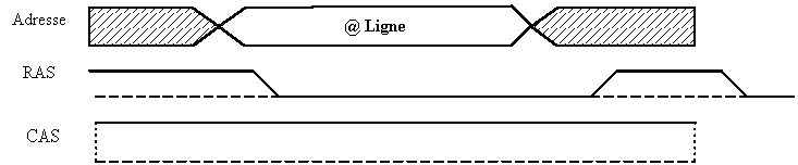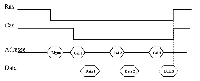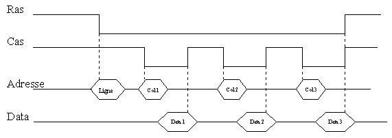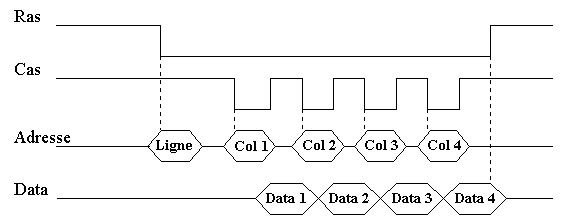 Pour de la mémoire DRAM tout court, l’accès à une donnée se fait en modifiant le signal RAS et CAS pour chaque lecture/écriture et ceci même si la donnée suivante se trouve sur la même ligne ou colonne.