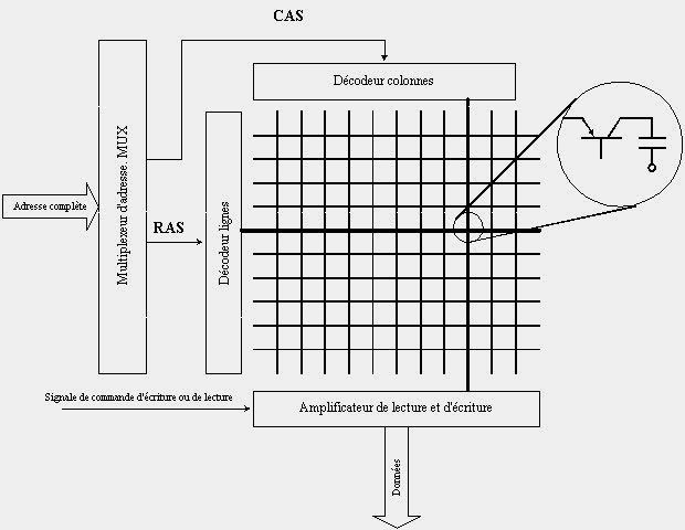 - Le circuit de multiplexage divise l’adresse en deux parties. Les bits de poids fort contiennent l’adresse de la ligne et les bits de poids faibles l’adresse de la colonne. Le signal Row Adress Strob ( RAS ) est généré pour indiquer à la DRAM qu’il s’agit d’une adresse ligne. Puis le signal Column Adress Strob ( CAS ) est généré pour indiquer à la DRAM qu’il s’agit d’une adresse colonne.