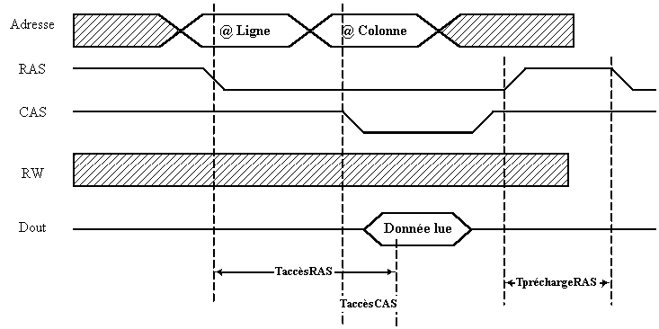 - TaccèsRAS : C’est le temps d’accès à partir de l’activation du signal RAS. Il s’agit du temps d’accès effectif en lecture.