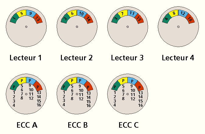 L’algorythme de détection et de correction d’erreurs utilisé pour RAID-2 est la technique ECC (Error Correction Code). Les données sont stockées selon le même principe que pour RAID-0 (répartition des bits sur plusieurs unités physiques), à la différence qu’on y rajoute des bits de contrôle ECC écrits sur une unité physique supplémentaire. Les exemples d’application classiques recommandent l’utilisation de 4 disques ECC pour 10 disques de données. Une solution alternative serait la combinaison de 4 disques de données avec 3 disques ECC (voir graphique).