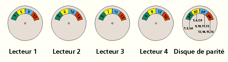 Le niveau RAID-4 est équivalent à RAID-3, mis à part la valeur du facteur d’entrelacement qui a la valeur de la taille du bloc physique de l’unité de données. Cette technique présente un avantage considérable : la lecture d’un nombre de blocs réduit n’impose pas un accès physique à l’ensemble des unités du système, mais se limite aux unités sur lesquelles sont stockées les données. Par conséquent, le système est capable de traiter simultanément plusieurs de ces requêtes. L’accès en écriture est lui aussi simplifié. Il suffit de lire le disque de données à réécrire et le disque de parité. Un calcul simple permet de calculer la nouvelle parité par addition de l’ancienne valeur aux nouvelles données. Aussi, les performances de RAID-4 pour les transferts réduits sont-elles améliorées par rapport à RAID-3.