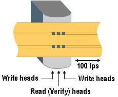 La tête du lecteur est généralement composée d’une tête d’écriture et de deux têtes de lecture. Ce procédé permet de relire le support juste après son écriture. Ainsi, le moindre problème ( support défectueux, … ) sera immédiatement détecté.