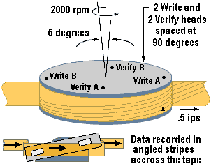 La tête de lecture est très proche de celle d’un magnétoscope vidéo. Elle utilise un procédé d’écriture hélicoïdal. La tête est composée de deux têtes de lectures et de deux têtes d’écriture. Ainsi, l’écriture de la seconde piste ne nécessite qu’un demi-tour, plus économe en temps qu’un tour complet.