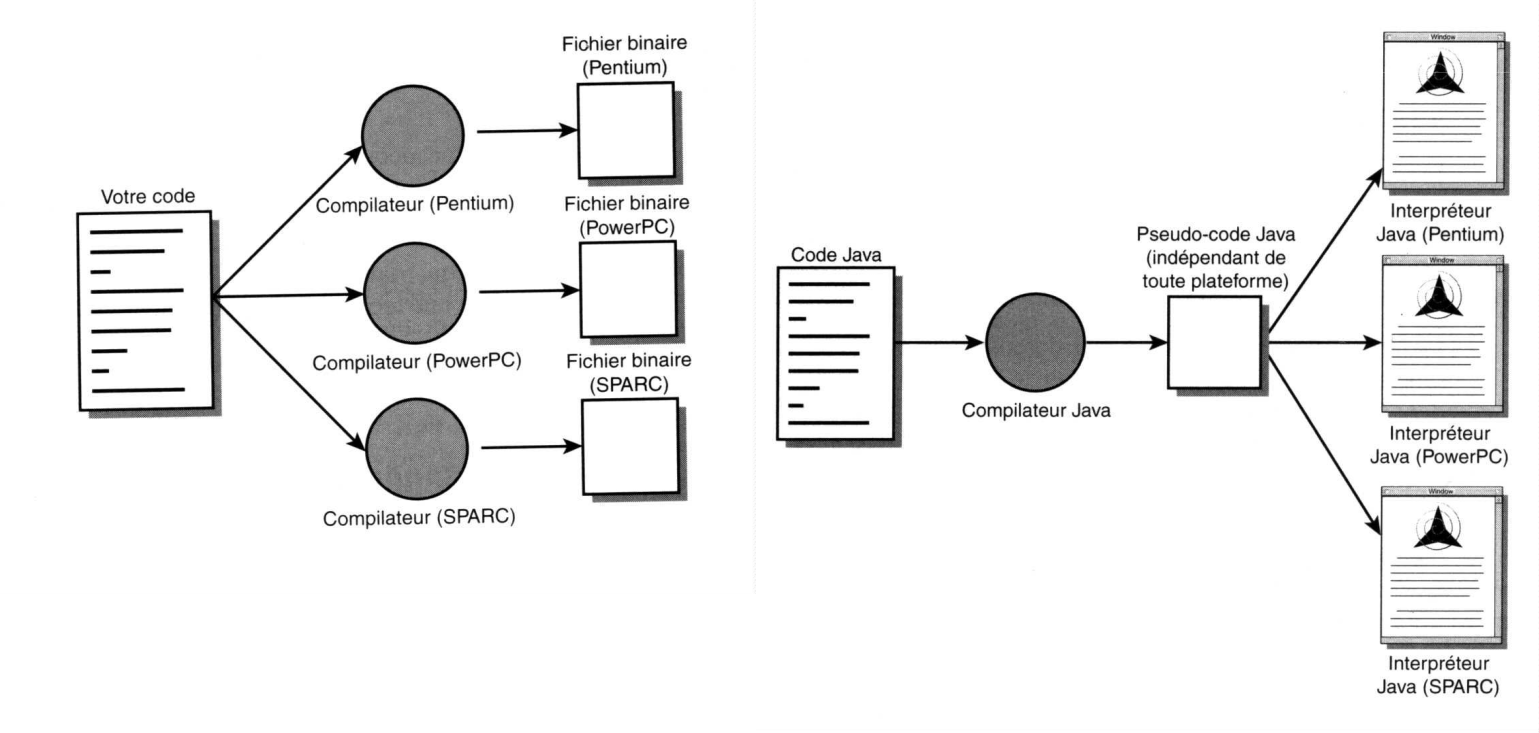 L’un des avantages évidents de ce langage est une bibliothèque d’exécution qui se veut indépendante de la plate-forme: en théorie, il vous est possible d’utiliser le même code pour Windows 95/98/NT, Solaris UNIX Macintosh, etc. Cette propriété est indispensable pour une programmation sur Internet (cependant, par rapport à la disponibilité sur Windows et Solaris les implémentations sur d’autres plates-formes ont toujours un léger décalage).